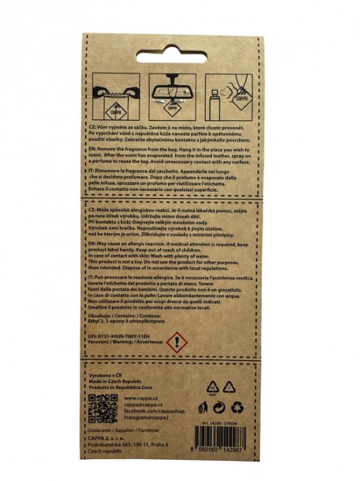 Přineste do svého automobilu nebo domácnosti nádech luxusu s naší originální vůní do auta Aroma Leather Tree Cherry vyrobenou z pravé hovězí kůže. Tento designový osvěžovač je nejen účinný, ale také stylový doplněk, který zaujme každého, kdo hledá kvalitu a dlouhotrvající vůni. Vůně je napuštěna prémiovým francouzským parfémem, který příjemně provoní vaše auto, byt nebo kancelář. Díky své univerzálnosti ji můžete zavěsit kamkoliv, nebo ji umístit na jiné místo v interiéru. Po vyprchání původní vůně stačí na kůži nastříkat libovolný parfém a osvěžovač můžete používat znovu a znovu. Tento produkt nabízí praktické a dlouhotrvající řešení pro všechny, kteří si potrpí na kvalitu a design. Svěžest, která nezmizí – vůně v tomto koženém osvěžovači vydrží dlouhou dobu, ať už v autě, na stole nebo v jiném prostoru. Navíc si můžete zvolit jakýkoliv parfém, který vám nejvíce vyhovuje. Profil vůně: Hlava: Mandle – sladká, jemná a lehce ořechová vůně, která přináší pocit hřejivého pohodlí a pohody. Banán – ovocná, krémová a jemně nasládlá vůně, která dodává svěžest a exotický nádech. Srdce: Višeň – ovocná a lehce kyselá vůně, která je osvěžující a zároveň vysoce aromatická, vytvářející bohatý a živý dojem. Malina – sladká a šťavnatá, její svěží tóny dokonale doplňují višni a dodávají vůni hravost a ovocnou sladkost. Základ: Pižmo – smyslné a teplé, dodává hloubku a dlouhotrvající vjem vůně. Vanilka – bohatá, krémová a jemně sladká, přidává vůni hřejivost a elegantní dotek. Kokos – exotická, krémová a sladká vůně, která uzavírá celkový dojem a přináší pocit tropického ráje. Klíčové vlastnosti: Vyrobeno z pravé hovězí kůže v České Republice Napuštěno francouzským parfémem Možnost opakovaného použití – stačí nastříkat nový parfém Moderní a elegantní design Užijte si trvalou svěžest a styl s naším exkluzivním koženým osvěžovačem vůní. Luxusní francouzský parfém s unikátním profilem vůně: mandle, banán, višeň, malina, vanilka, kokos a pižmo Možnost opakovaného použití – jednoduše nastříkejte nový parfém Ideální pro zavěšení do auta nebo použití v domácnosti Užijte si nezaměnitelnou vůni, která přináší nejen svěžest, ale i pocit luxusu do vašeho každodenního života. Aroma Leather Tree Cherry je symbolem elegance, kvalitního zpracování a nekonečných možností. Průmyslový design a provedení chráněno společností CAPPA 2 s.r.o. (2024-42300, číslo zápisu:38236)Doprava ZDARMA po celé ČR