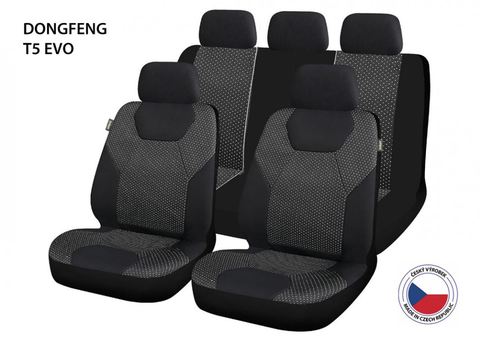 Autopotahy pro Dongfeng T5 EVO jsou dostupnou alternativou k dražším potahům na míru. Unikátní střih dělá z této sady semi-speciál vhodný k montáži na širokou škálu vozů. Autopotahy Perfetto GL jsou vyrobeny a certifikovány atestem pro použití na sedadla vozidel i s bočními airbagy. V případě vystřelení airbagu se roztrhne speciálně ušitý šev na boční straně autopotahu. Autopotahy neklouzají po sedadle díky měkkému molitanu na vnitřní straně potahu. Středové části jsou vyrobeny z prošívané polyesterové tkaniny v Žakárovém stylu s dodatečným polstrováním. Boky a záda z elastického polyesteru. Na potazích předních i zadních sedaček je předpřipravený otvor pro opěrky hlavy. Potah je kompatibilní se sedačkami s odnímatelnými opěrkami hlavy. Zároveň je na boku předních sedadel otvor pro sklápěcí páčky. Zadní sedadla jsou vybavena zipy pro sklopení dělených sedadel v poměru 1/3 a pro použití zadní loketní opěrky. Sedák je vybaven otvory pro zámky pásů. Zadní opěradlo je vybaveno dalšími otvory pro použití 3. bezpečnostního pásu, sklápěcích hmatníků, apod. Střih LIMA je revoluční design firmy CAPPA pro zajištění maximální univerzálnosti potahu. Zámky pásů můžete vést skrze otvor v sedáku, opěrky hlavy a 3. bezpečnostní pás mají připravené prostorné otvory a zipy na vrchní straně opěradla. Pro pásy zabudované přímo v zadním opěradle jsou na krajích také připravené otvory. MATERIÁL: Prošívaná polyesterová látka v Žakárovém stylu Elastický polyester 3mm PUR pěna TECHNICKÝ POPIS: Vyrobeny a certifikovány atestem pro použití s bočními airbagy Autopotahy neklouzají po sedadle díky měkkému molitanu na vnitřní straně potahu Předpřipravené otvory pro opěrky hlavy a sklápěcí páčky Zadní sedadla jsou vybavena zipy Potahy jsou vhodné do vozidel s dělenými zadními sedačkami v poměru 1/3 na obě strany Kompatibilní se zadní loketní opěrkou, 3. pásem i integrovanými pásy Sada pro 5 sedadel Snadná montáž Autopotahy je možné prát v pračce na 30° Balení autopotahů obsahuje 11 dílů: Sedadlo řidiče 1× opěrná část 1× sedací část 1× potah opěrky hlavy Sedadlo spolujezdce 1× opěrná část 1× sedací část 1× potah opěrky hlavy Zadní sedadla 1× sedací část spojená 2 zipy 1× opěrná část spojená 2 zipy 3× potah opěrky hlavyDoprava ZDARMA po celé ČR