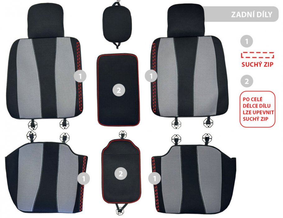Díky rozdělení zadních dílů se potahy lépe přizpůsobí tvaru sedadel a umožňují snadnější instalaci i při dělených zadních sedačkách.