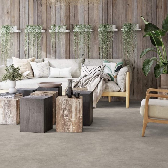 Moderní vinyl líbivé tmavší šedé barvy Iconik 280T Rock grey black imituje kamenný povrch a má teplý filcový podklad. Lamely mají příjemnou tmavší šedou barvu.