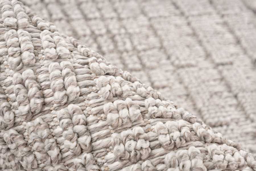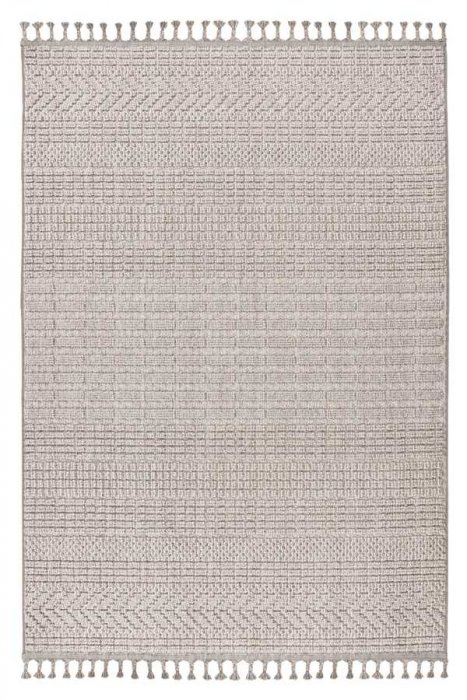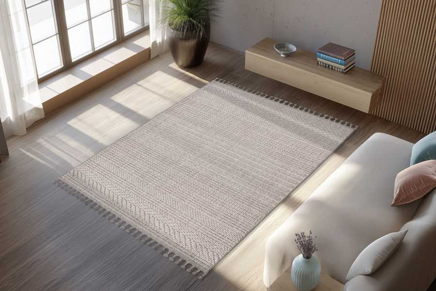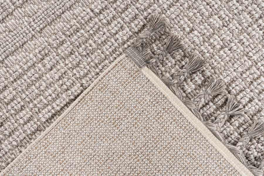 Kusové koberce Luxor se vyrábí v zemitých barvách šedé a béžové s jemným plastickým vzorem. Konce krátkých stran zdobí třásně smotané do tvaru nopků.