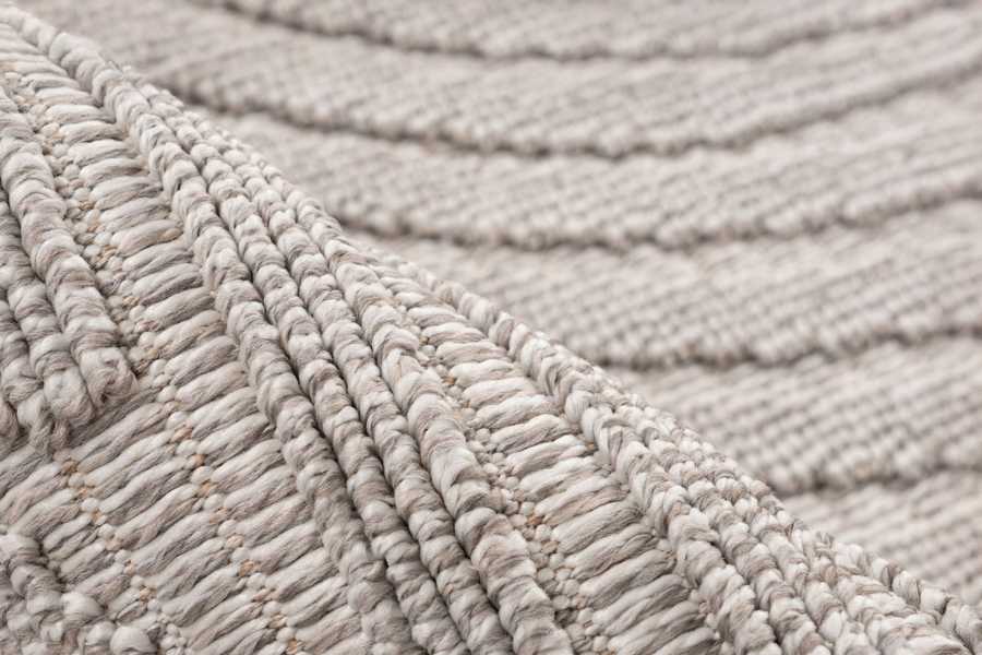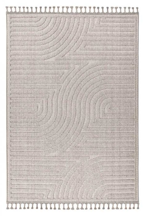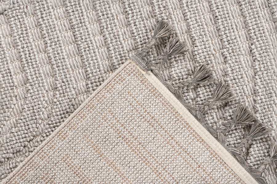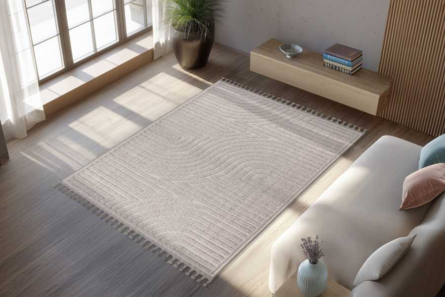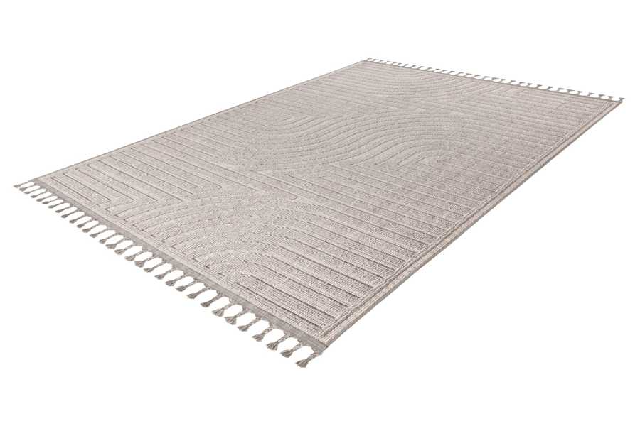 Kusové koberce Luxor se vyrábí v zemitých barvách šedé a béžové s jemným plastickým vzorem. Konce krátkých stran zdobí třásně smotané do tvaru nopků.