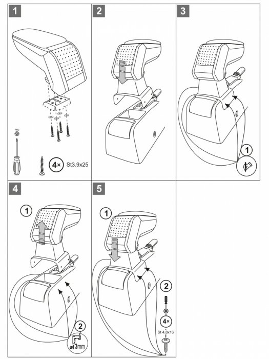 Instalace loketní opěrky je velice jednoduchá. Připevňuje se pomocí dvou šroubů, které jsousoučástí balení.