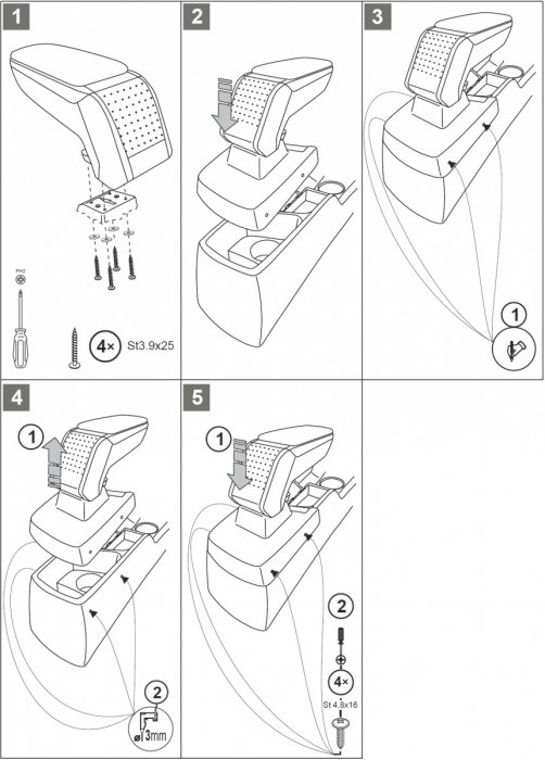 Instalace loketní opěrky je velice jednoduchá. Připevňuje se pomocí dvou šroubů, které jsousoučástí balení.