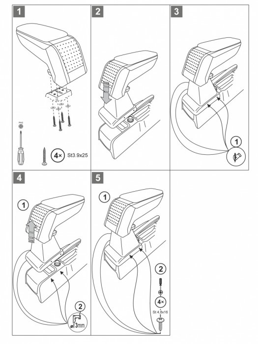 Instalace loketní opěrky je velice jednoduchá. Připevňuje se pomocí dvou šroubů, které jsousoučástí balení.