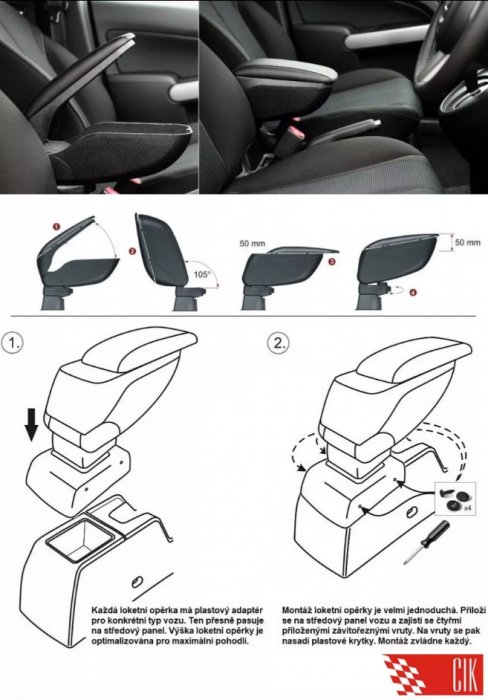 Instalace loketní opěrky je velice jednoduchá. Připevňuje se pomocí dvou šroubů, které jsousoučástí balení.