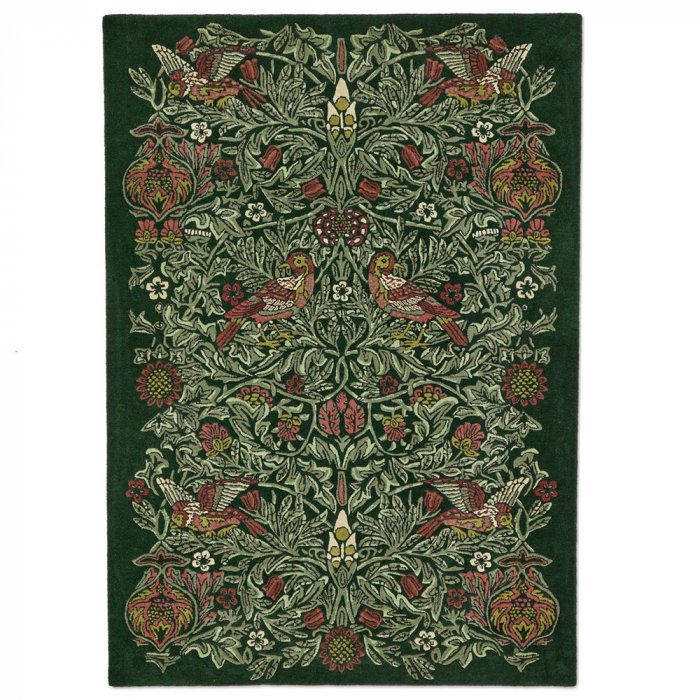 Barevný kusový koberec Morris & Co - Bird tump green s bohatým ornamentem květin a ptáčků. Pestrý koberec, kde převládá zelená barva, doplněná o jemné odstíny červené a béžové.