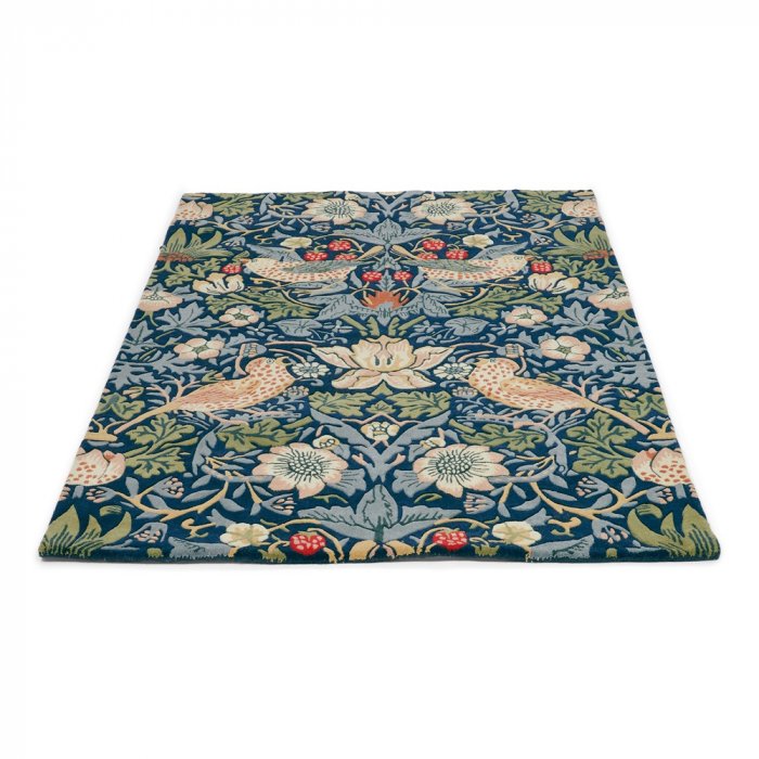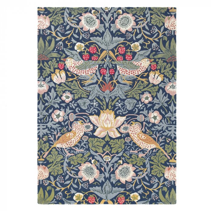 Barevný kusový koberec Morris & Co - Strawberry Thief indigo s bohatým motivem exotických květin, lesních jahod a ptactva.