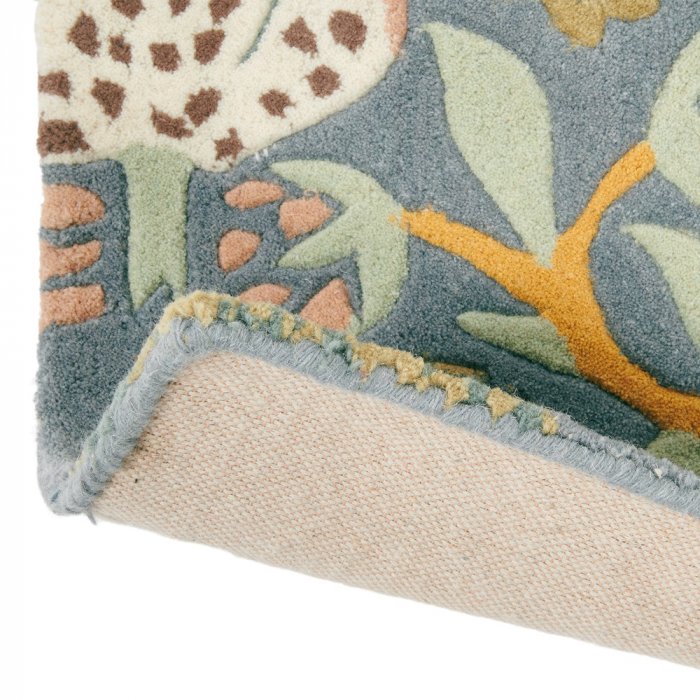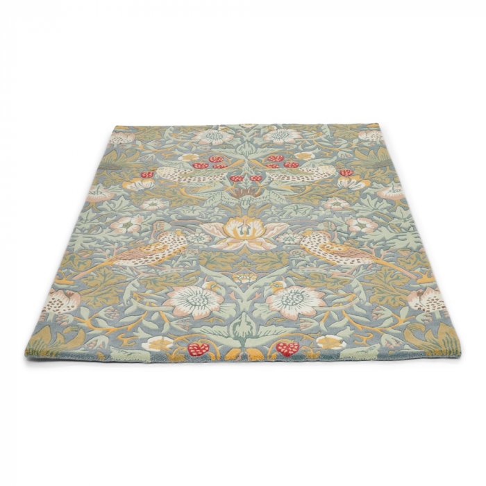 Barevný kusový koberec Morris & Co - Strawberry Thief slate s bohatým motivem exotických květin, lesních jahod a ptactva.