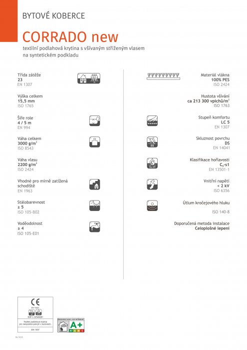 Střižený koberec v metráži CORRADO new je vysoce kvalitní koberec i pro náročné zákazníky . Koberec CORRADO je vyroben z jemného polyesterového vlákna s minimem lesku a patří mezi moderní bytové koberce. Koberec na podlaze působí jedinečným dojmem. Rubová strana koberce je tvořena syntetickým podkladem (AB)-pevnou mřížkou,která dodává i v prostoru koberci pevnost,tepelné a protihlukové vlastnosti.