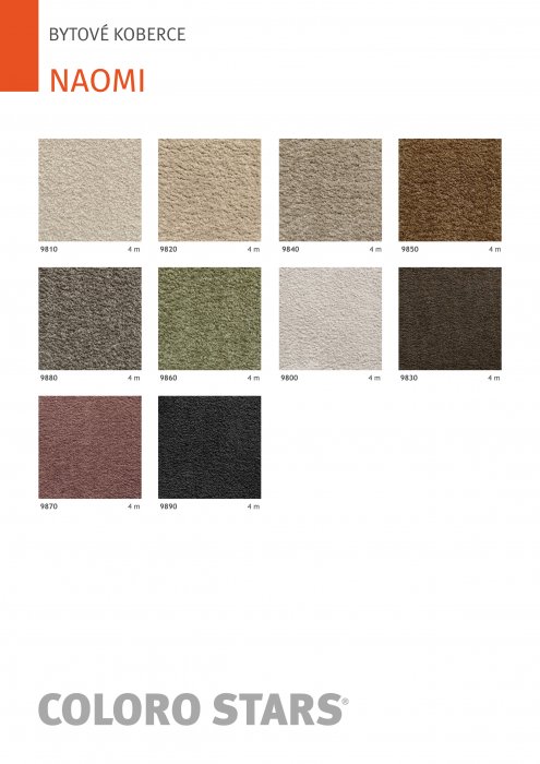 Koberec NAOMI je vyroben ze 100% polyesterového vlákna a patří mezi velmi kvalitní bytové koberce. Vlákno je velmi hebké na dotek a koberec na podlaze působí jedinečným dojmem. Rubová strana koberce je tvořena pevnou AB mřížkou,která plní funkci nejen tepelně izolační,ale i tlumí náraz a došlap.. Koberec NAOMI je vhodný do obytných prostor, především do ložnic a obýváku či chodeb. Je velmi jemný a příjemný na došlap, snadno se udržuje. Pokud chcete mít stále svá chodidla v teple a na příjemném koberci,pak koberec Naomi je skvělou volbou!