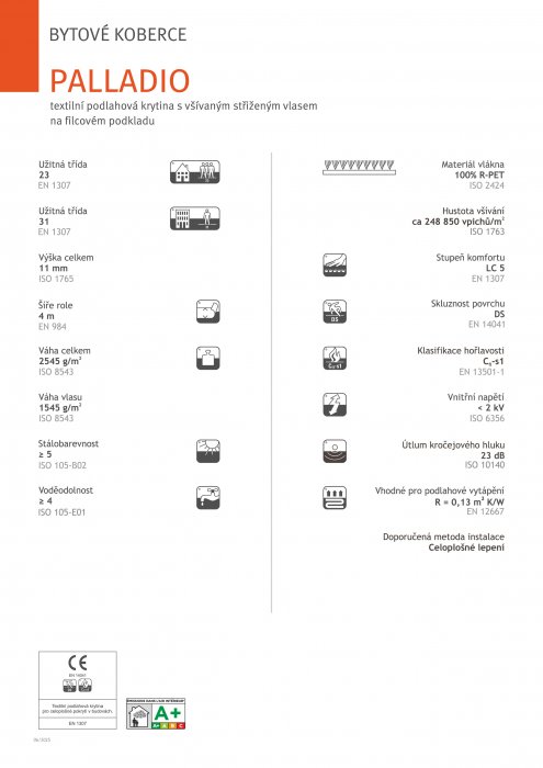 Rubová strana koberce je tvořena filcovým podkladem,který nejen tlumí zvuk,ale má i tepelně izolační vlastnost. je vhodný do prostor i s vyšší zátěží včetně pro podlahové vytápění.