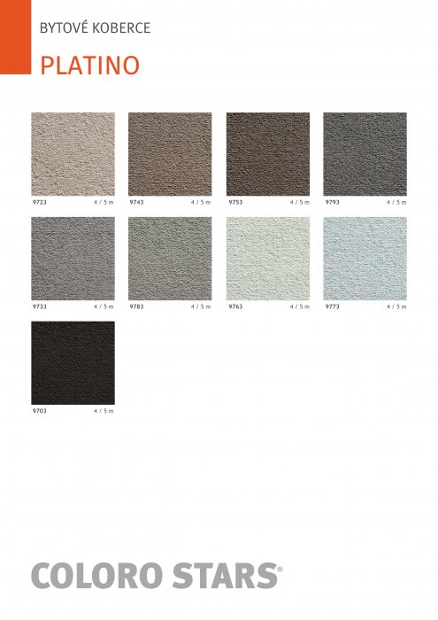 Koberec Platino se vyrábí v šíři 4 a 5 m. Na přání zákazníka zhotovíme i kusový koberec na míru v obdélníkovém,čtveratém,oválném či kruhovém tvaru včetně obšití v barvě koberce.