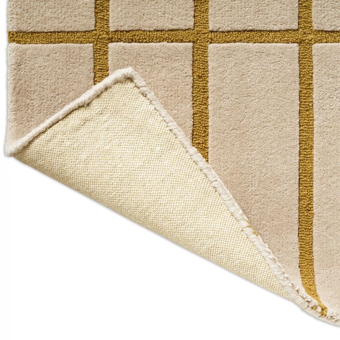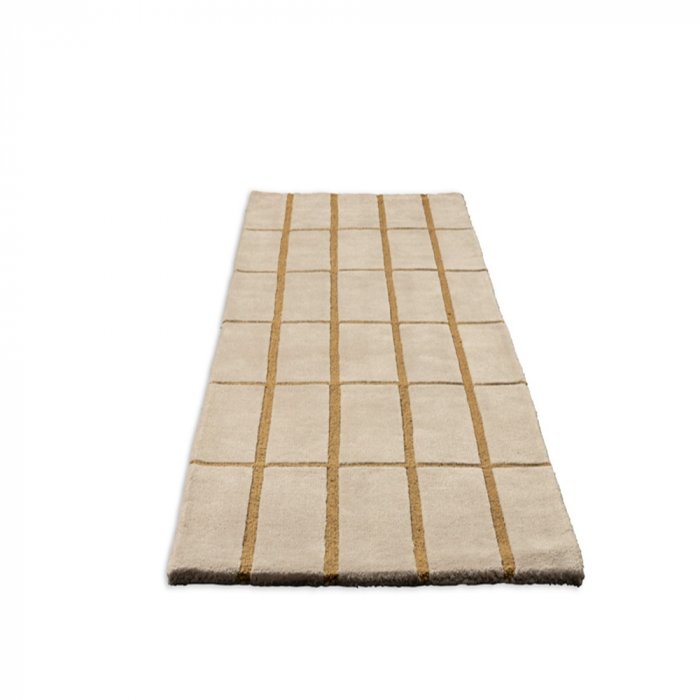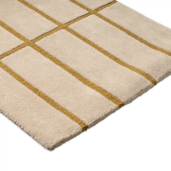 Luxusní vlněný koberec od finské značky Marimekko Tiiliskivi bronze yellow - výrobce Brink&Campman v béžové barvě, se zlatými proužky, poskládanými do cihliček.