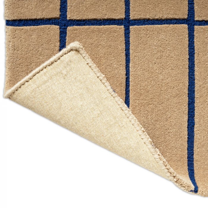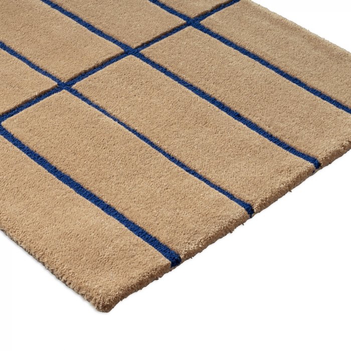 Luxusní vlněný koberec od finské značky Marimekko Tiiliskivi bright blue - výrobce Brink&Campman ve světle hnědé barvě, s modrými proužky, poskládané do cihliček.
