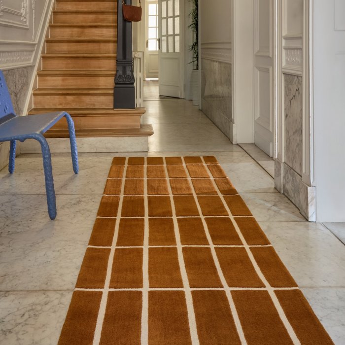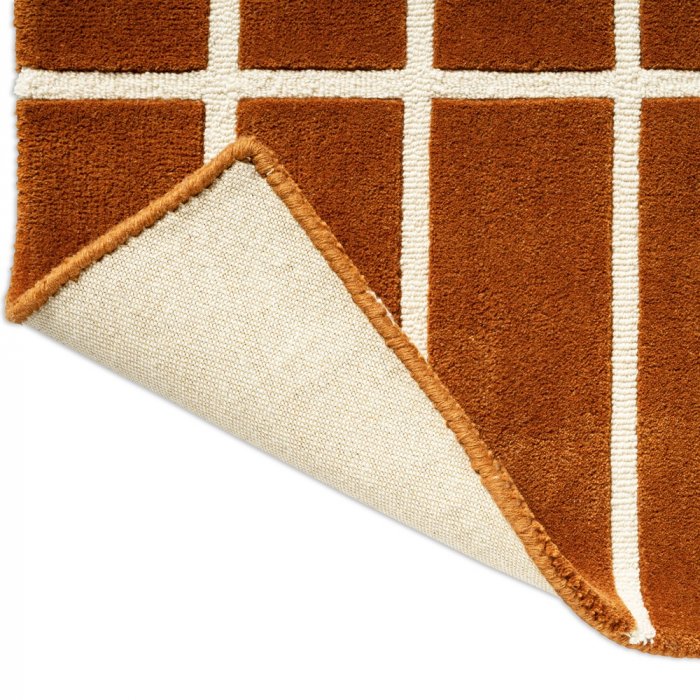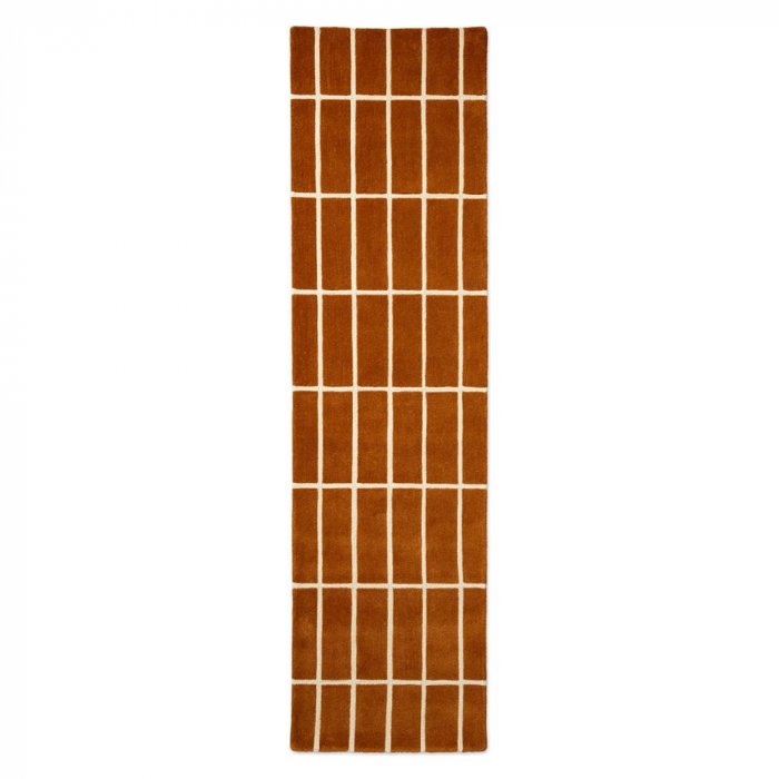 Luxusní vlněný koberec od finské značky Marimekko Tiliskivi brown - výrobce Brink&Campman v cihlově hnědé barvě, s béžovými proužky, poskládané do cihliček.