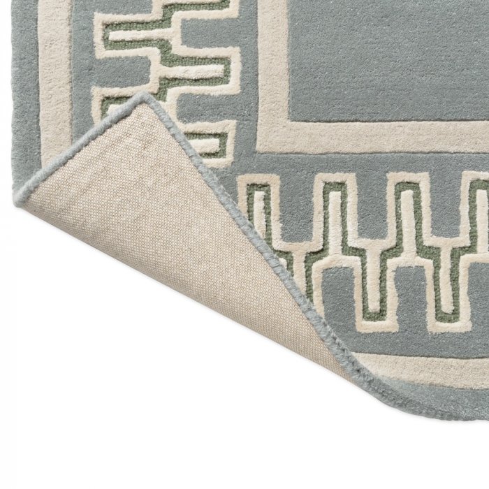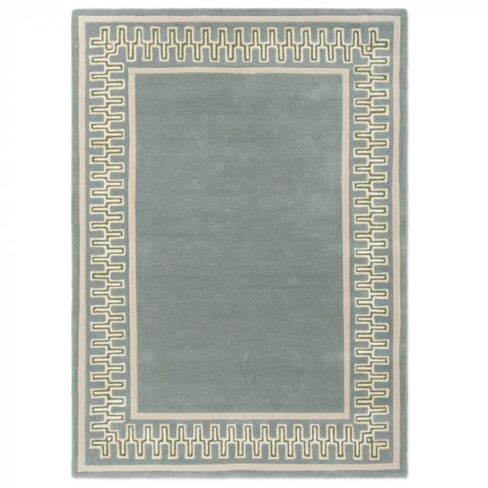 Luxusní, vlněný koberec Sanderson Linnean v šedo modré barvě s bordurou po obvodu. Koberec je vyroben ze 100% vlny s přídavkem viskózy pro jemný lesk.