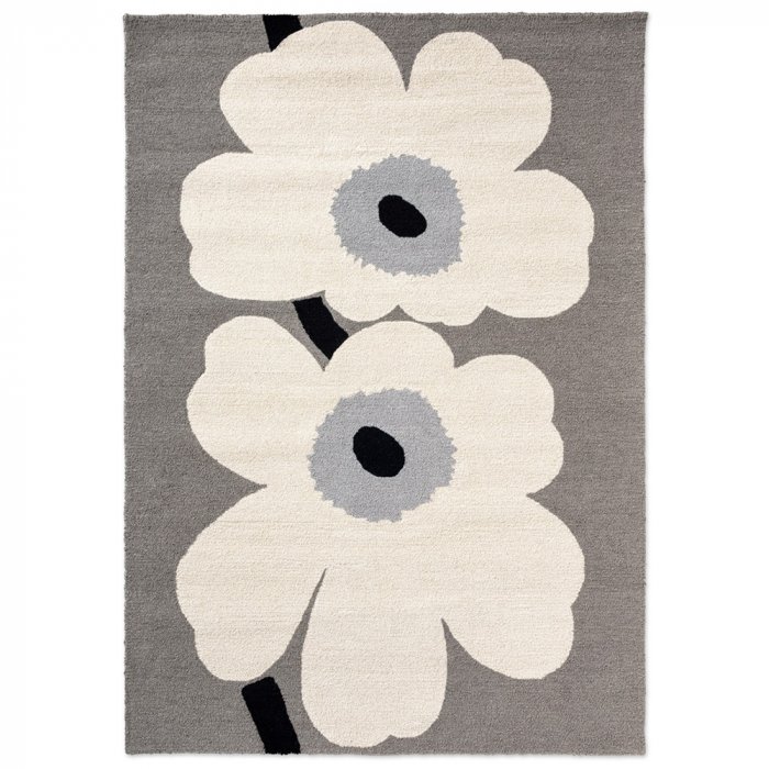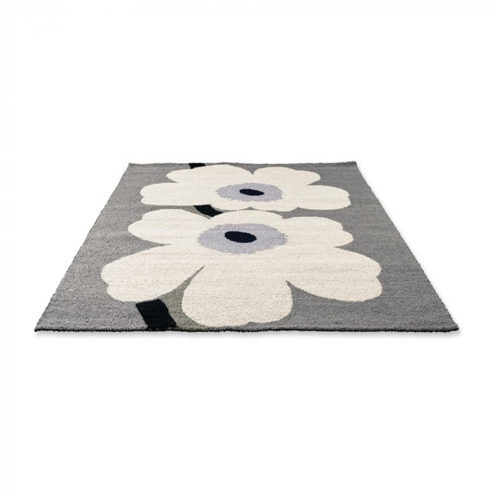 Moderní venkovní koberec Marimekko unikko 60th anniversary grey, s velkými bílými květy na světle šedém podkladu. Retro a moderna zároveň!