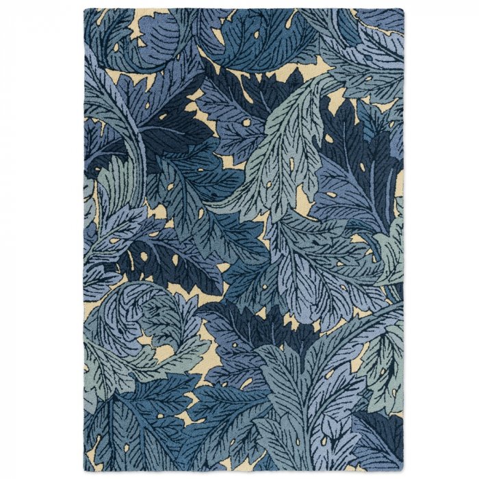 Moderní venkovní koberec Morris&Co Acanthus indigo s motivem modrých listů exotických rostlin na přírodně bílém podkladu.