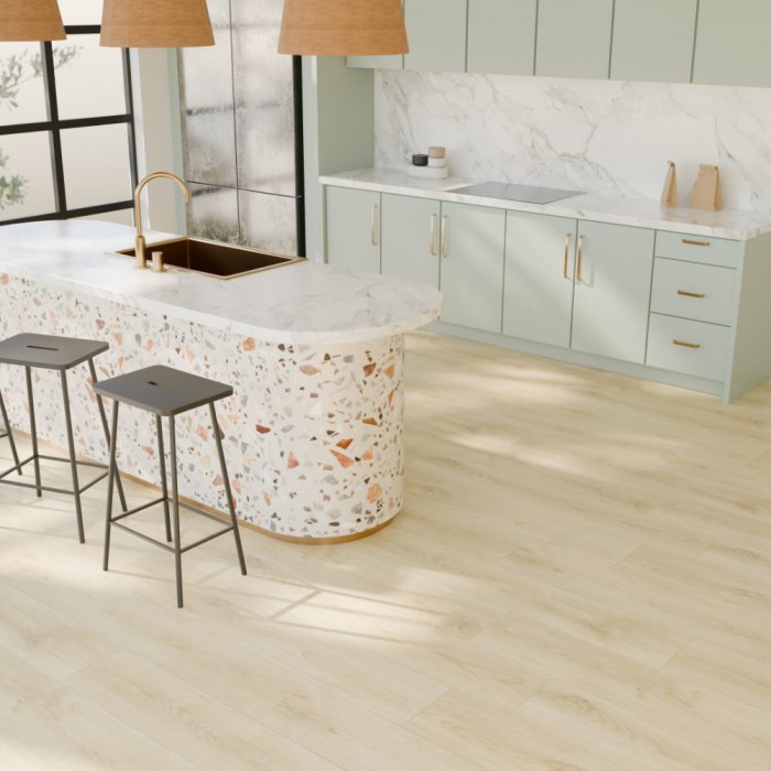 Megtrážový vinyl s dřevěným vzorem světlé barvy a šírkou lamely 20 cm.