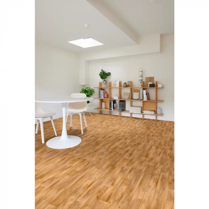 Praktická podlaha s dreveným vzorem přírodní zlatavé barvy, šírka lamely 14,3 cm.