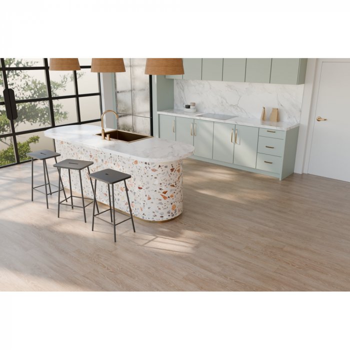 Moderní vinylová podlaha Novotex s filcovým podkladem a dřevěným vzorem světlejší hnědé barvy se šířkou lamely 11,1 cm.
